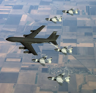 What a gorgeous shot! A 5-ship of the 124th TFS formate with a KC-135-BN of the 117th ARS/190th ARG, Kansas ANG. Those boys fly good form! Vought Retiree's Club